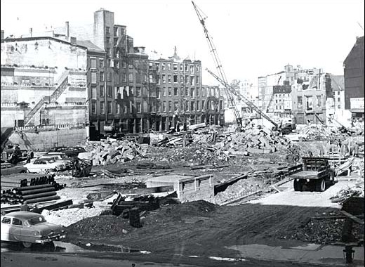 By the 1950’s, Boston’s West End had turned into a working poor residential area. The working class, largely Italian and Jewish communities, had strong ties to the neighborhood. Many residents agreed that the West End was a good place to live and that area was in the process of “deslumming”. However, the Housing Act of 1949 gave the City of Boston the authority for Urban Renewal in the West End. With this authority came the establishment of the Boston Redevelopment Authority (BRA) by Boston City Council. The Boston Redevelopment Authority was the municipal planning and development agency for Boston working on both housing and commercial developments. The West End demolition was one of the first projects that the BRA took on, uprooting the working poor communities. The BRA began the project with the demolition of Scollay Square. Buildings around Scollay Square were torn down to make room for the new government center known today as Boston City Hall. The BRA legitimized this demolition by pointing out that Scollay Square had evolved into a burlesque area and they wanted to get rid of it as quickly was possible.